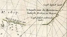 The land discovered by Leeuwin is recorded in Hessel Gerritsz' 1627 Caert van't Landt van d'Eendracht (Chart of the Land of Eendracht). This map includes a section of coastline labelled 't Landt van de Leeuwin beseylt A° 1622 in Maert ("Land made by the ship Leeuwin in March 1622"), which is thought to represent the coast between present-day Hamelin Bay and Point D'Entrecasteaux.[4] Portions of this coastline are labelled Duynich landt boven met boomen ende boseage ("Dunes with trees and underwood at top"), Laegh ghelijck verdroncken landt ("Low land seemingly submerged") and Laegh duynich landt ("Low land with dunes").[5]