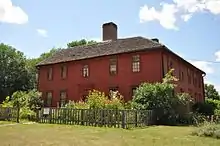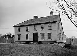 The Leffingwell Inn is located just south of the junction of Town and Washington Streets, at the southern end of the Norwichtown area. It is a 2+1⁄2-story wood-frame structure, built in stages in the 17th and 18th centuries. Its oldest part, the northeastern corner, dates to 1675 and was built by Stephen Backus. The Inn was founded by Thomas Leffingwell 2nd, the son of Norwich co-founder Thomas Leffingwell.[2] Over the next century it was altered and expanded several times, reaching its present configuration, which is a roughly square structure with two main facades and long sloping roof lines along the other two facades, as if two saltbox houses had been joined at a corner. It has many features dating primarily to the 18th century, including casement windows, wooden paneling, and several kitchen hearths, a further indication of the building's evolutionary construction history.[3]