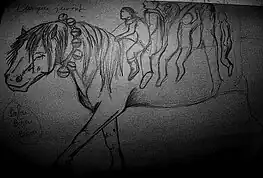 A study of changelings notes that "at the water's edge, the silhouettes of the goblin and the horse tend to merge".[26] According to another study on the dwarf in the Middle Ages, there are very close links between goblins and fantasy horses (or fairy-horses), for in both folk songs and more modern folklore, when the little people adopt an animal form, it is most often that of a horse.[27] The Japanese author Yanagida sees this as a ritual transformation of the horse into the liquid element, and notes that as far back as the Neolithic period, water genies have been associated with equines.[28]