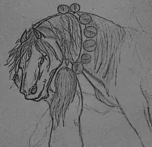 Ech goblin, in the form of a white horse wearing a bell collar around its neck. Pencil drawing.