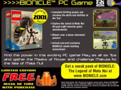The Legend of Mata Nui was originally set to release alongside Quest for the Toa in September 2001.[7] The game was later announced for a December release in the October 2001 Bionicle comic Triumph of the Toa,[8] and a port of the game for the Nintendo GameCube was planned for release in 2002.[9] At US$25, The Legend of Mata Nui would have been sold for a cheaper price than Quest for the Toa, which was sold for $40.[10]