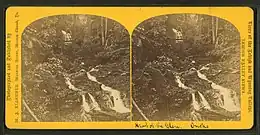 Historic stereoscopic view of the Glen Onoko Falls on the Lehigh River through the nature-destroyed remains of the former lower lock just above navigable waters in the Lehigh River