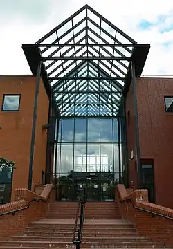 The new building was designed by the Property Services Agency in the Modernist style, built in red brick at a cost of £4.4 million,[3] and was opened in March 1981.[4][5] Originally established to deal with Crown Court hearings only, it was extended to accommodate the County Court hearings as well in the early 1990s.[6] The design involved an asymmetrical main frontage facing onto Wellington Street. The left hand section was formed by a two-storey block fenestrated by tall casement windows on the ground floor and by small square windows on the first floor. The central section, which was recessed, was formed by a flight of steps leading up to a glass door giving access to a full-height atrium with a steel-framed pediment, which projected forward. The right hand section, which projected forward and was fenestrated in a similar style to the left hand section, was formed by two separate blocks, the one on the left being taller than the one on the right. Internally, the building was laid out to accommodate ten courtrooms.[7]
