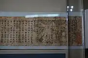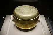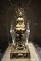 The former was placed in the earthly palace and contained a gold vessel wrapped in a thin gold sheet in the form of a coffin, the details of which are unknown as it was not opened, and was believed to contain the relics of the Buddha's bun hair; the latter is thought to have been placed in the heavenly palace and a gourd-shaped gold vase, which also contained the relics, was suspended inside the tower.[11][28]