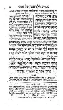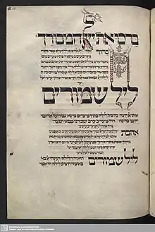 Lel Shimurim Oto El Hatzah (Hebrew: ליל שמורים אותו אל חצה, literally 'The Night of Protection which God Split in Half') is a Maariv piyyut for the Maariv service on the first night of Passover (the seder night) of unknown authorship, which originated in the classical period of piyyut (6th-8th century). This piyyut was accepted in all the communities of Ashkenaz and Poland,[1] France,[2] Italy,[3] Romania,[4] Algeria,[5] and also in the rites of Provence and Catalonia.[6]