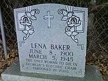 Lena Baker (June 8, 1900 – March 5, 1945)[1] was an African American maid in Cuthbert, Georgia, United States, who was convicted of capital murder of a white man, Ernest Knight. She was executed by the state of Georgia in 1945.[2] Baker was the only woman in Georgia to be executed by electrocution.[3][2]