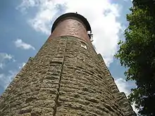 The Lena Water Tower is situated on a triangular section of land in the village of Lena, Illinois, located in western Stephenson County approximately 38 miles (61 km) east of Galena, Illinois. It is 22 feet (6.7 m) wide at its base and rises to a height of 122.5 feet (37.3 m).[1] The first 56 feet (17.1 m) of the structure was constructed from limestone blocks, each block measures 24 inches (61 cm) by 30 inches (76 cm).[1] Six stone buttresses flank the first 50 feet (15.2 m) of the water tower as well.[1] The 44 feet (13.4 m) beyond the limestone portion of the facade is faced in red brick.[1] The limestone was quarried east of the village.