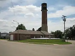 The Lena Water Tower is a water tower located in the village of Lena, Illinois, United States. It was built in 1896 following two decades of problems with structure fires in the village. The current water tower is the result of a second attempt after the first structure proved to be unstable. The tower stands 122.5 feet (37.3 m) tall and is built of limestone and red brick. The current stainless steel water tank holds 50,000 gallons (190,000 liters) and replaced the original wooden tank in 1984. The site has two other structures, an old power plant building and a 100,000 US gallon (380,000 L) reservoir. The Lena Electric Plant Building was constructed in 1905 and the reservoir completed in 1907. The Lena Water Tower was listed on the U.S. National Register of Historic Places in 1997; the reservoir was included as a contributing property to the listing.