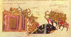 A force of armed citizens sallied out to meet Tornikios but was easily defeated. This spread panic among the capital's defenders, who abandoned their posts on the walls and their gates. Tornikios, however, instead of storming the unmanned walls, hesitated.[11] Contemporary historian, Psellus, wrote: "He was confidently awaiting our invitation to assume the throne: he assumed that he would be led to the palace by flaming torches, in a procession worthy of a sovereign."[12] Modern historian Norwich speculates: "Perhaps he wanted to spare a city he believed soon to be his from pillage".[12] Whatever his reasons, he lost his opportunity to take the city, for that night, Emperor Constantine managed to restore order and re-occupy the walls, to await the arrival of the Anatolian army. The next morning, Constantine, dressed in full imperial regalia, installed himself in a position where all of the besieging army could see him, giving the lie to Tornikios' claim that he was dead.[12]