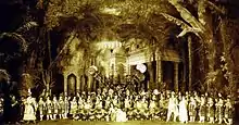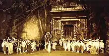 Act II of La Bayadère. In the center is Mathilde Kschessinskaya as Nikiya (right) kneeling with Vera Trefilova (left) who performed the Danse manu. Standing toward the right is Pavel Gerdt as Solor with Olga Preobrajenskaya as Gamzatti. St. Petersburg, 1900.