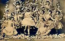 Act III of La Bayadère, the scene The Kingdom of the Shades. In the center is Mathilde Kschessinskaya as Nikiya with Pavel Gerdt as Solor. Kneeling toward the left is Varvara Rhykhliakova, Anna Pavlova, and Julia Sedova as the three soloist shades. St. Petersburg, 1900.