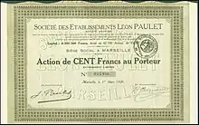 Share of the Société des Établissements Léon Paulet SA, issued 1. March 1920