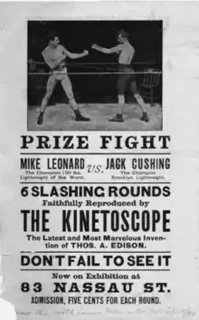 ![]() An advertisement for the Leonard-Cushing Fight, a 1894 black-and-white silent film, featuring a boxing match. | |