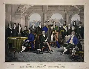 Not long after returning to Ireland, he became involved in radical politics, having already, in 1782, published a pamphlet in support of the Irish cause.[6] He became Dublin's leading radical lawyer of the day.[8] In 1792, he represented Napper Tandy, a radical member of the Irish Parliament, in a legal dispute over parliamentary privilege.[6] In the early 1790s, McNally became a founder member of the United Irishmen,[9] a clandestine society which soon developed into a revolutionary Irish republican organisation.[10] He ranked high in its leadership and acted as the organisation's chief lawyer, representing many United Irishmen in court.[11][12] This included defending Wolfe Tone and Robert Emmet, the leaders of the 1798 and 1803 rebellions respectively, at their trials for treason.[13] In 1793, McNally was wounded in a duel with Sir Jonah Barrington, who had insulted the United Irishmen.[6] Barrington subsequently described McNally as "a good-natured, hospitable, talented and dirty fellow".[6] John O'Keeffe described McNally as having "a handsome, expressive countenance and alive sparkling eyes".[14]