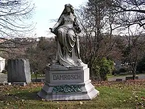 In 1883, Damrosch traveled extensively through the west with his orchestra. In September 1884, he began a remarkable series of operatic performances as General Manager and chief conductor of the Metropolitan Opera in New York. The company had experienced great financial losses during its first season of Italian opera under director Henry Abbey. For its second season it turned to Damrosch to direct the company in German repertory. The company comprised some of the greatest artists of the German opera houses, and, in contrast with the hitherto prevailing mode, every part, even the smallest, was carefully presented. Twelve of the operas performed were comparative novelties, the most important of which were Wagner's Tannhäuser, Lohengrin, and Die Walküre, and Beethoven's Fidelio. This proved to be Damrosch's last effort. He conducted every performance except during the last week of his life, when he took a severe cold, from which he never recovered.[5] He died in New York City in 1885. His funeral was held at the Metropolitan Opera House. Damrosch was buried in Woodlawn Cemetery in The Bronx, New York City.