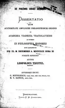 Treitel's main academic and scholarly interest revolved around the Hellenistic Jewish philosopher Philo of Alexandria ( c. 20 BCE – c. 50 CE). Starting in 1870 with his PhD thesis, De Philonis Judaei Sermone Dissertatio, written in Latin, he published a number of books and articles on Philo and his philosophy, culminating in his magnum opus Die gesamte Theologie und Philosophie Philos von Alexandria (The complete theology and philosophy of Philo of Alexandria), published in 1923. In the first century CE, Philo had attempted to merge Greek thinking and Judaism by using allegory.[21] According to Treitel, Philo employed "rabbinic methods and patterns of interpretation, although Greek methodology did make a deep impact upon the content."[22] Philo's works were rejected by contemporary Judaism. Influenced by Frankel and Graetz, Treitel attempted to demonstrate the importance of Philo's philosophy to Jewish thinking, particularly because of Philo's emphasis on the social order of Jewish life and the universal interpretation of the Jewish scriptures.[23] Philo's appeal lay in the fact that he "did not imply an abrogation of the law, but rather to the contrary its wider dissemination and thus affirmation."[24]