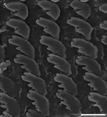 The large main cusp of the central tooth of radula is accompanied by prominent ectocones. The 7-8 adjoining lateral teeth in half a row have equally small ectocones. All these teeth have prominent basal plates with interrow support ridges. In the first marginal tooth, the main cusp is less symmetrical and the basal plate is less prominently developed. The following c.10 marginal teeth are increasingly more asymmetrical initially, with an endocone on the main cusp and ectones with two or three cusps in the teeth closer to the margin, which are irregularly comb-like when the main cusp with the endocone becomes relatively smaller.[1]
