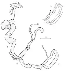 Drawing of the reproductive system of Leptacme cuongi with detail of the penial lumen after a transparent specimen (upper right).