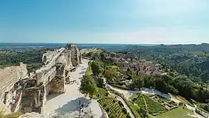 It is located in the Alpilles mountains, northeast of Arles, atop a rocky outcrop that is crowned with a ruined castle overlooking the plains to the south. Its name refers to its site: in Provençal, bauç is a rocky spur. From the village name the word bauxite was coined for aluminium ore when first discovered there by geologist Pierre Berthier in 1821. Until 13 August 1958, the commune was officially named La Baux.[3]