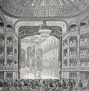 Later revivals were often in a reduced, two-act version, first performed on 21 June 1814.[6][7] A staging of Les bayadères in its original three acts was chosen to mark the inauguration of the Paris Opéra's new home, the Salle Le Peletier, on 16 August 1821.[8]