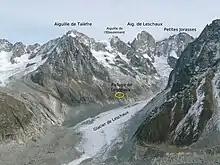 The Leschaux Hut (French: Refuge de Leschaux) is a refuge in the Mont Blanc massif in the Alps. It is located at 2,431 m on the north side of the Glacier de Leschaux – a tributary of the Mer de Glace. It is owned by the CAF and can accommodate up to 19 people. The hut is used as a base by mountaineers climbing peaks such as Grandes Jorasses, Petites Jorasses and Mont Mallet. It is accessed by going up the Mer de Glace from Montenvers, and then up the Glacier de Leschaux.[1]: 33 [2]: 314 The first refuge was built in 1929. It was enlarged to 30 seats in 1934, but destroyed by an avalanche in 1954. A new hut was built in 1968 and was enlarged in 2003.[3]