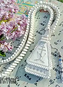At the bottom of the lestovka hang four lapostki, which are flaps, usually triangular, but such variations as bell or oak-leaf shapes are not uncommon. These represent the four Gospels, and sometimes have icons, crosses, religious symbols or scripture verses printed or stitched on them, the stitching around these leaves symbolising the teaching of the Gospels. Simpler lestovkas will have the lapostki covered with silk brocade or velvet, and this is a traditional way of reusing church fabrics, either of vestments that have become too worn out for clergy to wear, or of altar-coverings and similar fabrics.