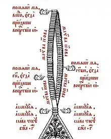 The Lestovka is traditionally constructed of leather, with "steps" made by looping leather around small twigs sections on which paper scrolls with Jesus prayer are wound. It has a total of 109 "steps" – small loops or knots, unevenly grouped: 3/12/38/33/17/3 steps. Traditionally, Lestovki are made from genuine leather, but poorer people make Lestovki from fabric or other materials.