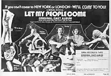 Let My People Come is a musical with book and music by Earl Wilson, Jr. and lyrics by Wilson and Phil Oesterman.[1] Subtitled "A Sexual Musical", the sexually-explicit show originally ran from 1974 to 1976 at The Village Gate Theater in Greenwich Village, New York City. It began previews on Broadway on July 7, 1976, and closed on October 2, 1976, after 108 preview performances, technically never 'officially' opening for regular Broadway performances.[2] The score includes songs such as "I'm Gay", "Come in My Mouth", "Fellatio 101" and "The Cunnilingus Champion of Company C", and features on-stage nudity.