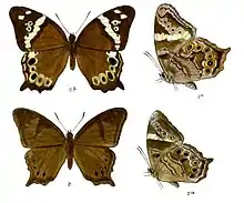 Wingspan of adult is less than 30 mm. Sexes show sexual dimorphism. Male has dark brown dorsal surface, whereas female resemble female Lethe drypetis coloration. In male, a sub-marginal row of small black spots found on the hindwing. On forewing, yellowish brown patches appear near the upper margin. Ventral surface dark brown with purple tinge. All eye spots rounded. Eye spots on hindwing possess a yellow ring, which is lack on forewing eye spots. There is a whitish irregular oblique line on forewing. This white line is much broader in female.[3] Host plant belongs to family Poaceae such as Arundinaria debilis.[4]