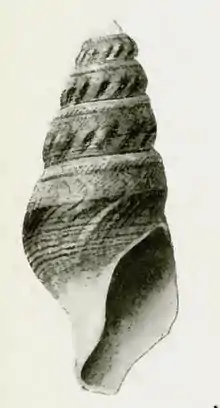 (Original description) The white shell is covered with a brownish olive periostracum. The shell contains five or more moderately rounded whorls exclusive of the (lost) protoconch. The suture is distinct with a wide rounded ridge in front of it, forming the posterior boundary of the anal fasciole. The spiral sculpture consists of a few obscure threads on the fasciole and in front of the shoulder 8 or 9, on the body whorl 15 to 18 flattish, rather close-set threads smaller and closer anteriorly and absent from the siphonal canal. The axial sculpture consists of more or less distinct incremental lines, and on the upper spire of about 15 very oblique anteriorly protracted riblets chiefly visible at the shoulder and obsolete on or entirely absent from the last two whorls. The anal sulcus is wide, deep, rounded, the fasciole slightly impressed. The outer lip is thin, sharp and arcuately produce The inner lip is erased. The columella is short, white, obliquely attenuated in front. The siphonal canal is short, wide, distinct and slightly recurved. [3]