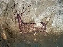 The artists appear to have used feathers, in a relatively complex painting technique, compared to the art of the Upper Paleolithic, that produced relatively simple figures. Figures are often outlined, apparently after the main body was painted. Some figures are shallowly engraved rather than painted. The figures are relatively small, between about 8 and 1 inch (20.3 and 2.5 centimetres) high, and in one or two colours. The paint was generally very thin, using mineral earths (often reddish) or charcoal, and the paintings are preserved by a very thin transparent layer of limescale forming over them from water dripping down the wall.[8] Some figures have more than one coat of paint, which has led to claims that they were repainted after long periods, though this seems not universally accepted.[9]