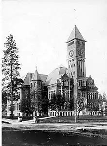 Fire destroyed South Central High School in 1910, shortly after sunrise on June 21.[1][4] The blaze destroyed the interior of the school but left the remains of the exterior walls standing. In January 1911, citizens passed a bond issue of $500,000 to pay for replacement of the school. In a ceremony, former President Teddy Roosevelt laid the cornerstone of the school on April 8, 1911.[1] Students attended classes at North Central while work progressed on the new school.[5] Problems in construction and strikes by workers delayed the opening until April 1912. Meanwhile, the Spokane Daily Chronicle encouraged readers to enter a contest to suggest names for the new high school. Richard Hargreaves, the principal of North Central, suggested the names of Lewis and Clark, using one name for each high school, North and South Central. The school board settled for naming the south side school Lewis and Clark High School.[3]