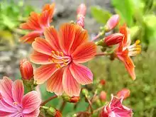 Lewisias are perennial flowering plants native to western North American habitats including rocky outcrops from the high elevation alpine to lower elevation chaparral, oak woodlands, and coniferous forests. They produce rosette-shaped flowers in a range of different colours.[1] Lewisia cotyledon grow up to 0.5 metres (1.6 ft) in height and width.[2]