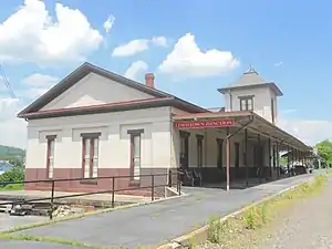 The station house, according to volunteers that staff it, is the oldest structure built by the Pennsylvania Railroad which is still standing. The current passenger depot was constructed in 1849 as the freight station, while the Pennsylvania used a nearby three story hotel building as the passenger depot until 1868. Operations were moved into the freight station, while the old brick building became a hotel, restaurant, and a Railway Express Agency. That building was demolished in the 1950s,[4] and currently sits as a small lot.[5] "J" Tower, which was added in the 1870s as a two story-brick tower within the depot, was removed in the 1950s,[3] During restoration of the depot, a replica of "J" Tower was installed into the building.[1]