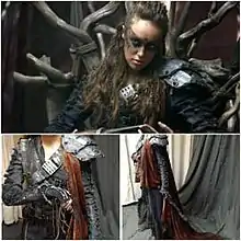 Dany Roth of Syfy was impressed by the show's costume designs, stating that they are "possibly the best on TV right now. Each costume tells the story of the world, of the people, of the specific character". He said that, like Mad Max, The 100 "understands that the Grounders are repurposing tools and clothing from a time long dead. But the costumes are far from uniform. The people who lived on the ark, the people who live in the forest, the people who live in a frozen tundra, they all dress differently". Although "there's fashion here that makes the clothes exciting", it is the clothes that tell the story.[18] Maureen Ryan of Variety, stated that the "most enduring image of Lexa is one of her sitting on a throne made of intertwined branches, her enigmatic eyes looking out from a face half-covered in elaborate war paint".[19] Debnam-Carey said, "I'm lucky they put me in such a badass costume and makeup. We did a whole day of tests with that makeup." She and the wardrobe and makeup department collaborated with Rothenberg on the look of the character, and fans were encouraged to contribute their versions of the designs on social media.[19][20]