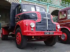 The semi-bonneted original Comet was first shown in December 1947.[1] While intended mainly for export, it was also sold in the home market. The wheelbase is 17.5 ft (5.3 m) and the gross weight 8.75 long tons (8,890 kg).[2] A coach model seating 33, sharing the same front design, appeared in 1948.[1] The cab was built by Briggs Motor Bodies and was shared with the Ford Thames ET6 (after-Ford Model TT, Ford Model AA, Ford Model BB, and Fordson 7V) and Dodge 100.[3] Ford purchased Briggs in 1953, meaning Leyland (and Dodge) were forced to develop new cabs. The original engines were a 75 hp (56 kW) diesel or a 100 hp (75 kW) petrol unit; the petrol version was rarely seen in Britain.[4]