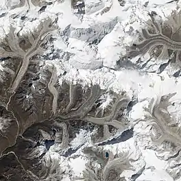 ![]() The glacier is located to the northeast of the rounder Imja Tsho lake shown south of centre | |