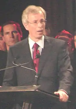Former Liberal House Leader Don Boudria[32] served as Dion's Campaign Chair and Paul Martin's BC Lieutenant Mark Marissen was his National Campaign Director.[33] One-time Progressive Conservative leadership aspirant David Orchard also announced his support of Dion.[34] Additional high-profile supporters included then-leader of the Saskatchewan Liberal Party David Karwacki,[35] Jamie Elmhirst, the President of the British Columbia wing of the Party,[36] Adam Campbell, the President of the Alberta wing of the Party,[37] former Green Party of Canada deputy leader Tom Manley,[38] former Prime Minister Paul Martin's Chief of Staff Tim Murphy,[39] Herb Metcalfe, former John Manley Campaign Chair, and Marc-Boris Saint-Maurice the co-founder and former leader of the Marijuana Party of Canada.[40] Former Justice minister Allan Rock endorsed Dion on December 1.