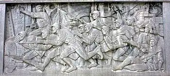 Construction of the pavilion was completed in September 1986.[1] The entire structure stands about 34 meters tall and occupies an area of 617 square meters.[1] Its overall architectural design follows classical Chinese patterns. Set on broad stone pedestal, the pavilion proper has two stories and is capped by an eaved roof. However, the sides of the pedestal are decorated with bas-relief stone carvings that depict scenes from the civil-war battle for Jinan in the style of Socialist realism. Another notable decorative feature of the pavilion are the gilded relief inscriptions that read "Liberation Pavilion" on the stone pedestal as well as on the pavilion proper. The characters of these inscriptions were taken from the handwriting of Marshal Chen Yi,[1] who commanded the Shandong counter-offensive during the Chinese Civil War. The interior of the pavilion houses an exhibition related to the civil war battle for Jinan.