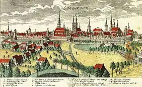 view of the Habsburg Legnica in 1738. Knight's Academy marked with number 6.