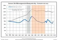 Development of population since 1875 within the current boundaries (Blue line: Population; Dotted line: Comparison to population development of Brandenburg state; Grey background: Time of Nazi rule; Red background: Time of communist rule)