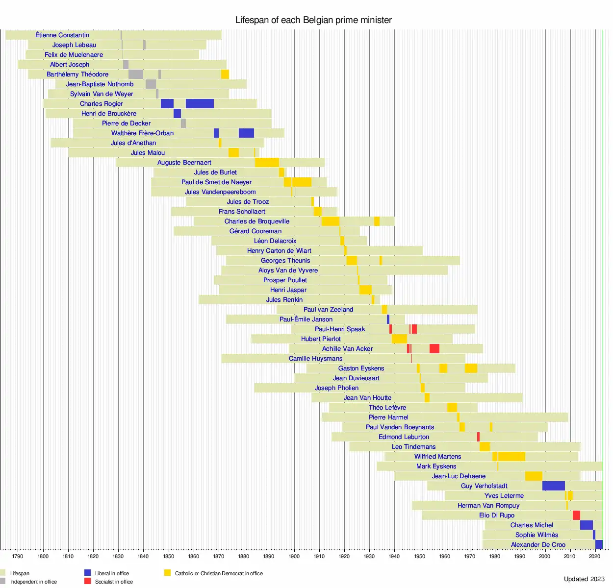 This is a graphical lifespan timeline of prime ministers of Belgium. Fifty-three persons have served as Prime Minister of Belgium since the office came into existence in 1830, although it was named Chief of Government from 1830 until 1918. They are listed in order of office (prime ministers leading nonconsecutive governments are listed in the order of their first premiership).