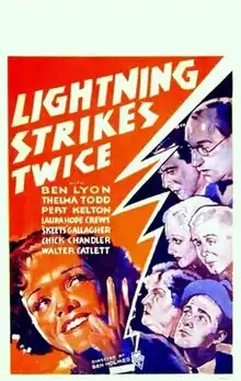 Lightning Strikes Twice is a 1934 American comedy film directed by Ben Holmes from a screenplay by Joseph A. Fields and John Grey. It stars Ben Lyon, Thelma Todd, and Pert Kelton. A print is held by the Library of Congress.[2]