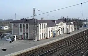 The station building is located between the railway tracks. Immediately west of the station lies a walking bridge. The station building is a modest building of two main floors under a tabernacle roof with projections between central and lateral sections and a small triangle pediment over the front entrance. Such architecture performing is not trivial. Designers used architectural forms which give large and high spaces, often modeled on classical forms from the Roman Empire. The high windows of the waiting room have semicircular upper parts. The facade is decorated with pilasters. A cornice above small corbels crowns the top of the station building.[5][6]