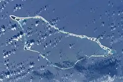 Likiep Atoll (Marshallese: Likiep, [lʲiɡiɛpʲ][1]) is a coral atoll of 65 islands in the Pacific Ocean, and forms a legislative district of the Ratak Chain of the Marshall Islands. It is approximately 55 kilometers (34 mi) northwest of Wotje. Its total land area is only 10.26 square kilometers (3.96 sq mi), but that encloses a deep central lagoon of 424 square kilometers (164 sq mi). Likiep Atoll also possesses the Marshall Islands' highest point, an unnamed knoll 10 meters (33 ft) above sea level. The population of Likiep Atoll was 228 in 2021.[2]