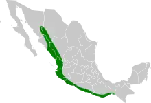The lilac-crowned amazon's endemic range spans along the pacific coast of Mexico, beginning in southeastern Sonora and southwestern Chihuahua down to southern Oaxaca.[4] In Sinaloa and northern Nayarit the geographic range of the lilac-crowned parrot is above 375 meters of elevation and does not reach sea level until southern Nayarit, where it remains so through Jalisco and Oaxaca.[4][5]