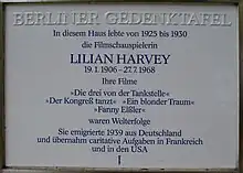 - 1 2 "Lilian Harvey, Actress, Dead. Star of 'The Congress Dances'. Popular Screen Performer of the 20s and 30s. Operated Souvenir Shop in Antibes". The New York Times. 28 July 1968. Retrieved 19 March 2010.