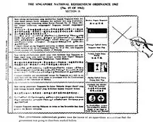 The Barisan demanded that general elections be held for a clear mandate on merger.[2]: 86 Instead of general elections, however, the PAP committed themselves to a national referendum for merger.[11] However, rather than a simple yes-no referendum, the PAP developed a referendum with all three choices agreeing to merger but in different forms (see the referendum ballot slip below).