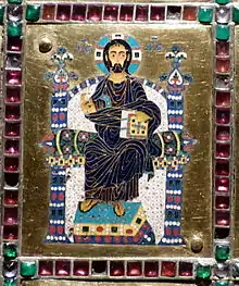 The Limburg Staurotheke (from Greek σταυρός stauros, "cross" and θήκη theke "container") is an example of a Byzantine reliquary, one of the best surviving examples of Byzantine enamel, in the cloisonné technique. It was made sometime in the mid to late 10th century in Constantinople. The box measures 48 cm (19 in) by 38 cm (15 in) and has a depth of 6 cm (2.4 in). This reliquary design was common in Byzantium beginning in the 9th century.[1] It was probably brought to Germany as loot from the Fourth Crusade, and is now in the diocesan museum of Limburg an der Lahn in Hesse, Germany.