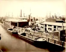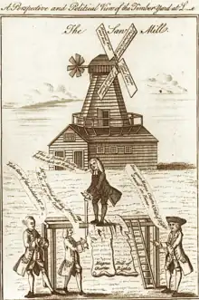 At the northern end of the Cut was a conflict with a property called Four Mills, which was in fact a group of five tidal water wheels.[16] Nathaniel Beardmore, the Lee trustees' engineer, described the conflict as it was in early Victorian times: